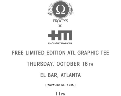 The PROCESS x ThoughtMarker tees are ready for Thursday night’s event at El Bar. Remember to come out and say the password, “Dirty Bird” to score yourself one of these, especially if you rep ATL hard.